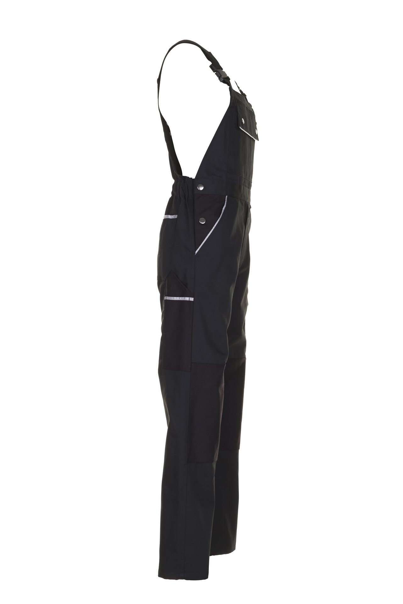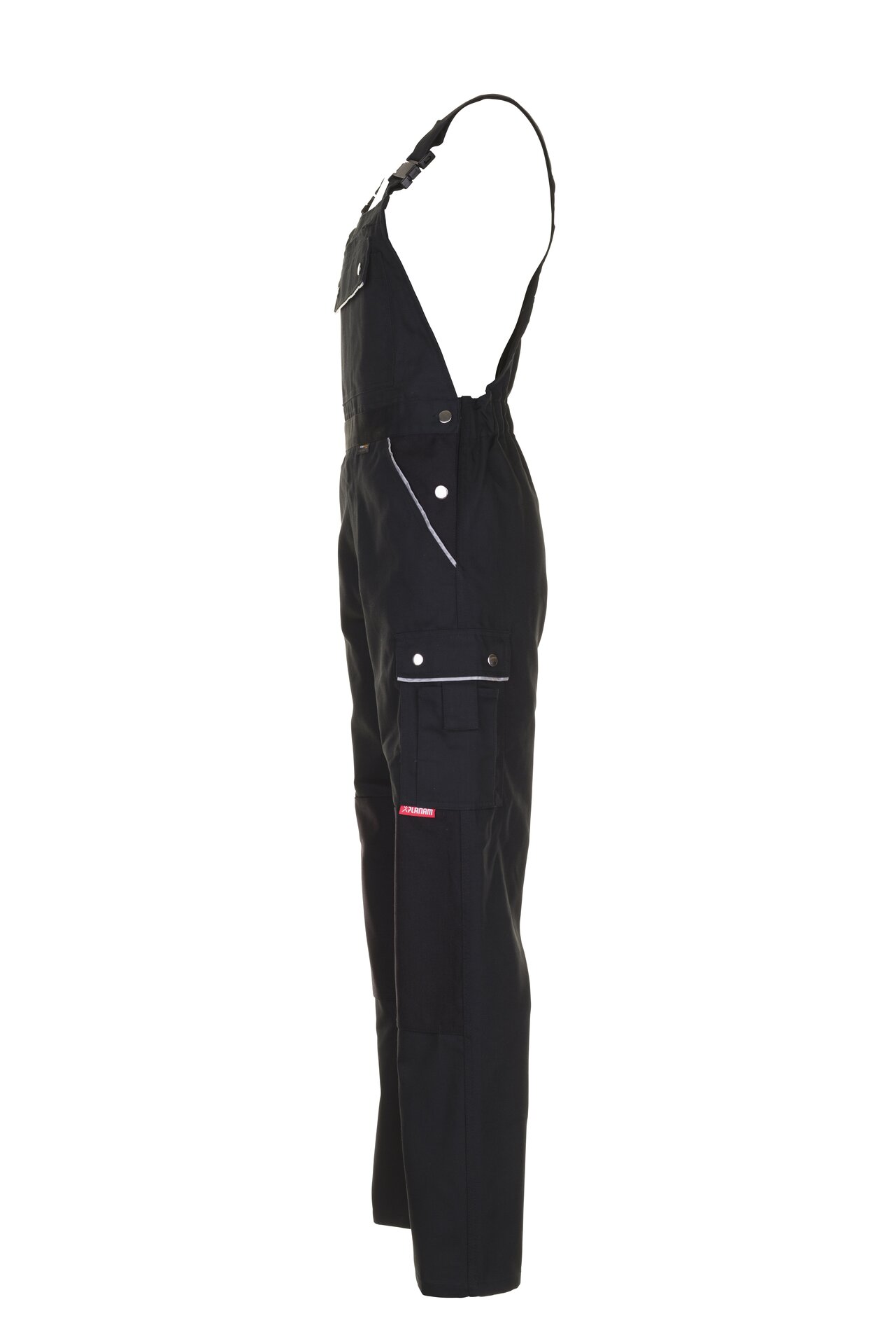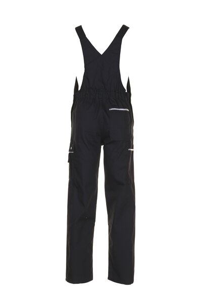 Bequeme schwarze Latzhose aus der Planam Canvas 320 Serie mit elastischen Gummibandeinsätzen und doppelter Latztasche