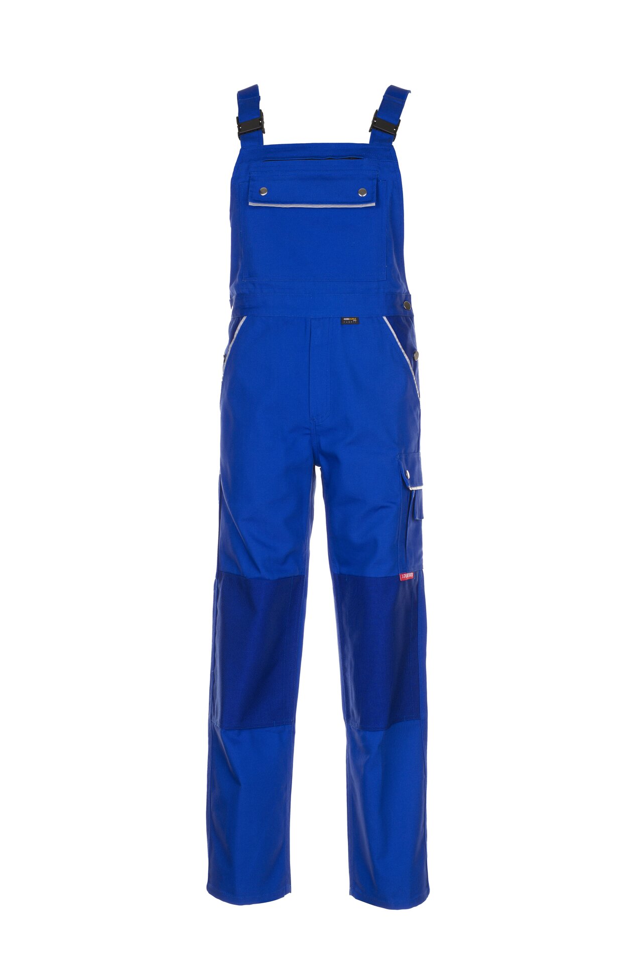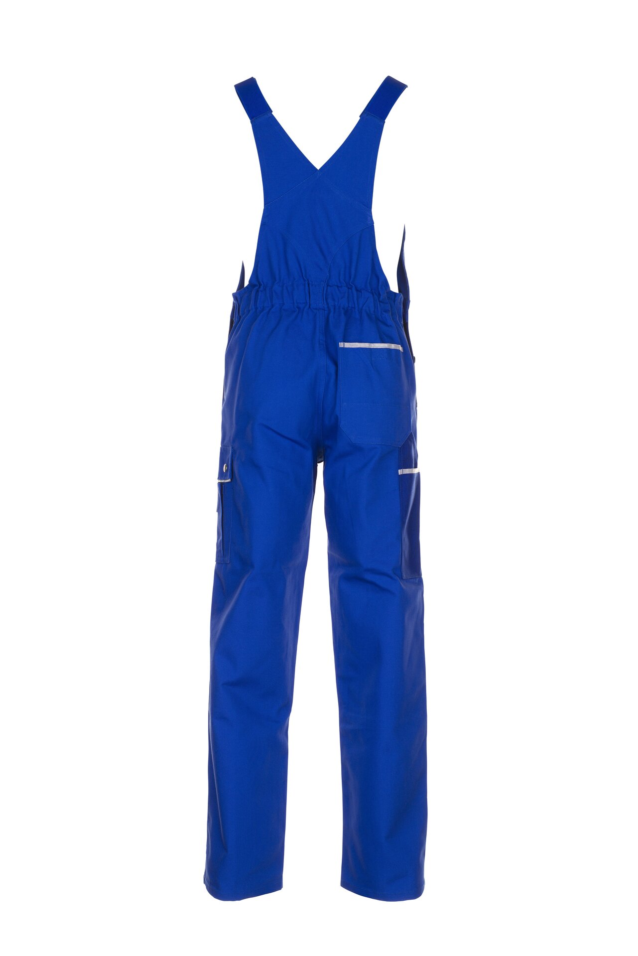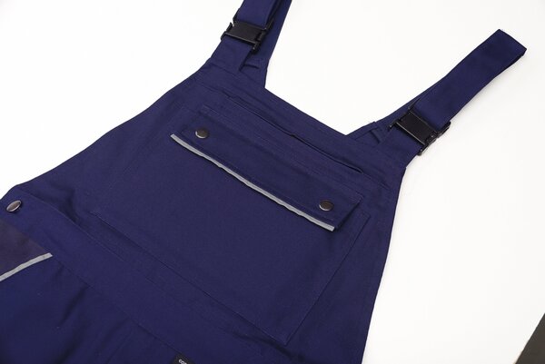 Bequeme blaue Latzhose aus der Planam Canvas 320 Serie mit elastischen Gummibandeinsätzen und doppelter Latztasche
