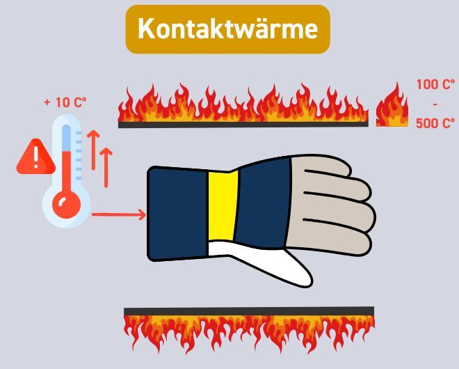 Bei dieser Prüfung wird getestet, wie gut der Handschuh Hitze bei direktem Kontakt isoliert. Die Außenseite wird für 15 Sekunden einer Temperatur von 100 °C bis 500 °C ausgesetzt. Dann wird gemessen, bei welcher Temperatur sich die Innenseite um 10 °C erwärmt.