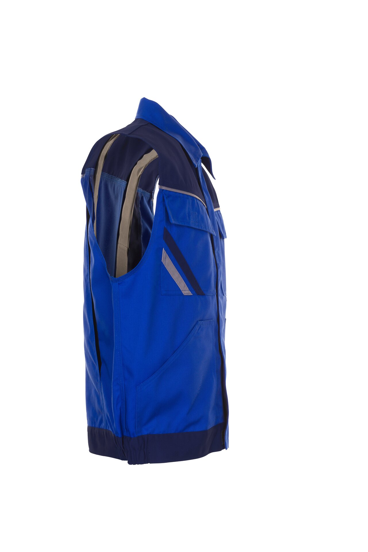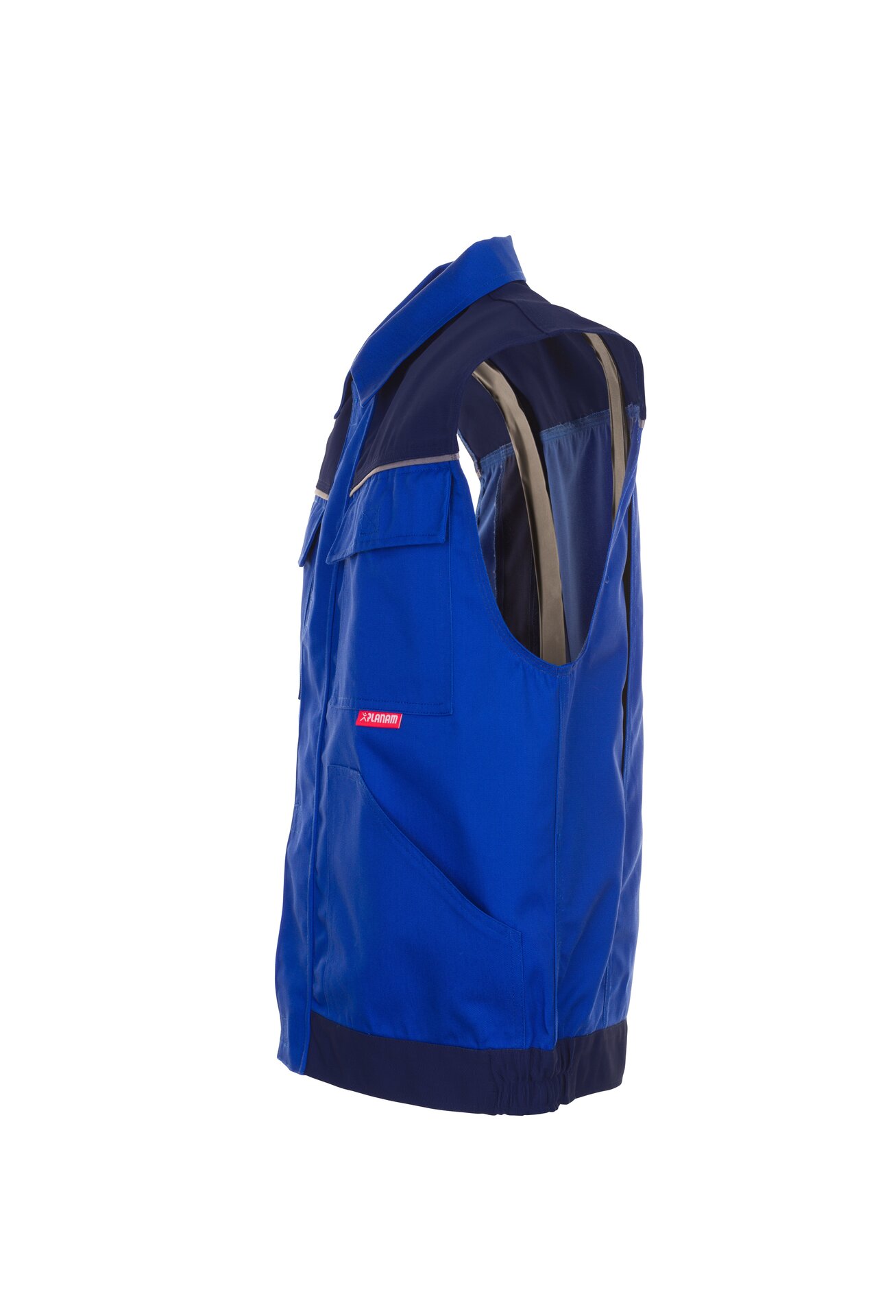 Blaue Arbeitsweste aus der Planam Highline Serie mit 3-facher Kappnaht und Gummizug im Bund